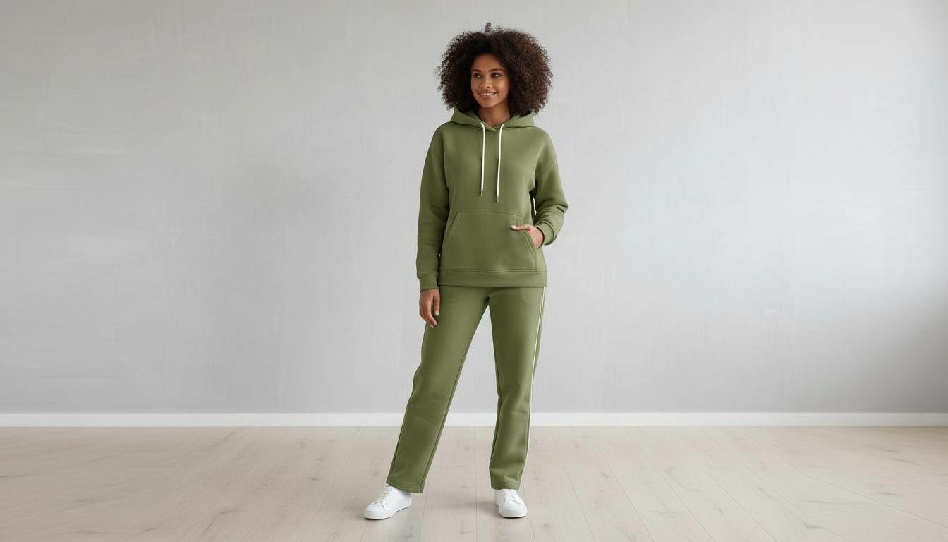 Bequemes Damen Homewear-Set in Olivgrün – kuscheliger Hoodie mit Kängurutasche und passende Hose mit sportlichen Streifen.